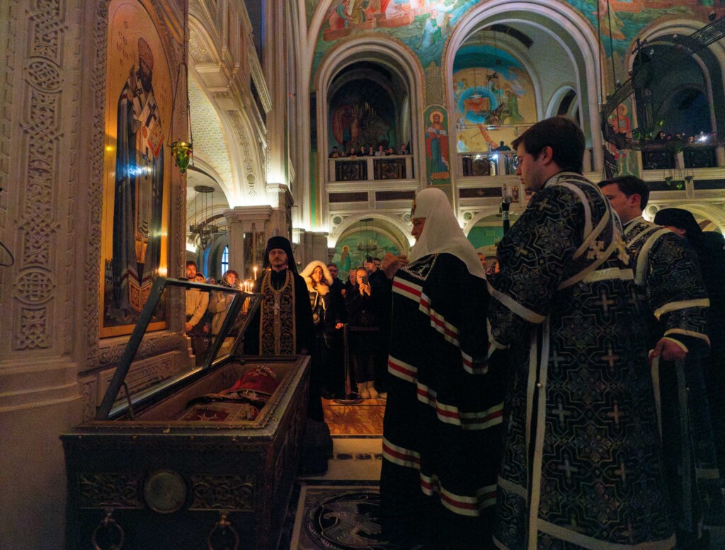 По прибытии в храм Предстоятель Русской Православной Церкви поклонился мощам священномученика Илариона (Троицкого).