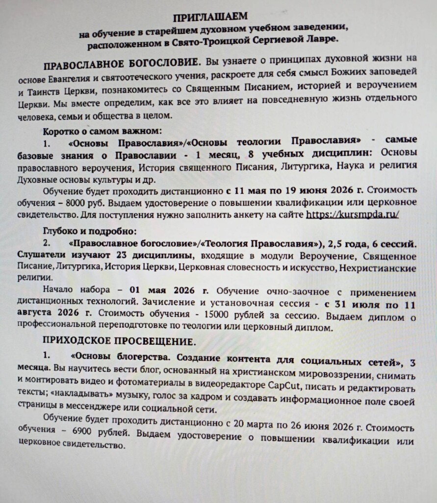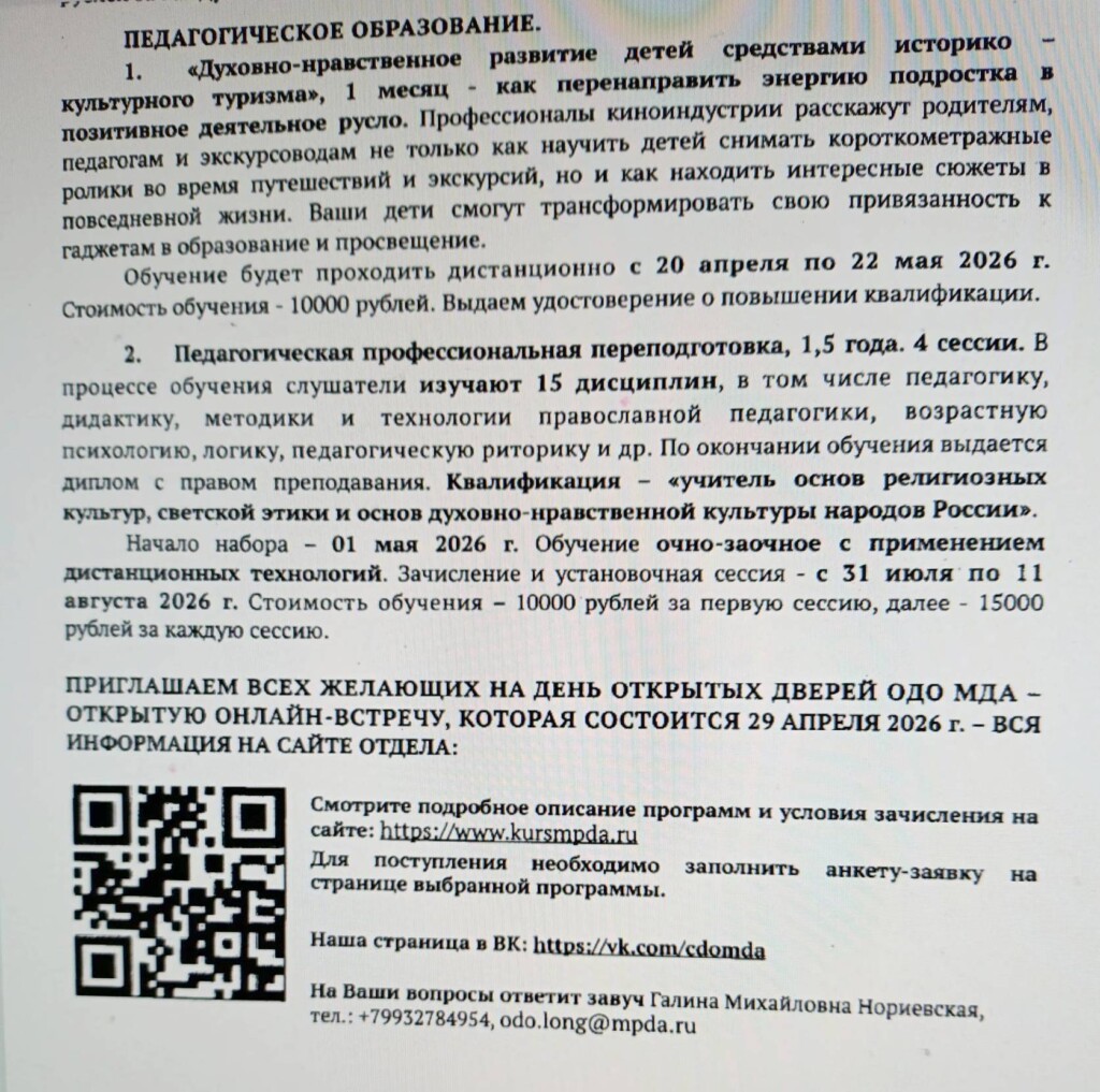 - 31 июля - 11 августа 2026 г. "Подготовка специалистов в области приходского просвещения (единого профиля)", 1,5 года (очно-заочное);