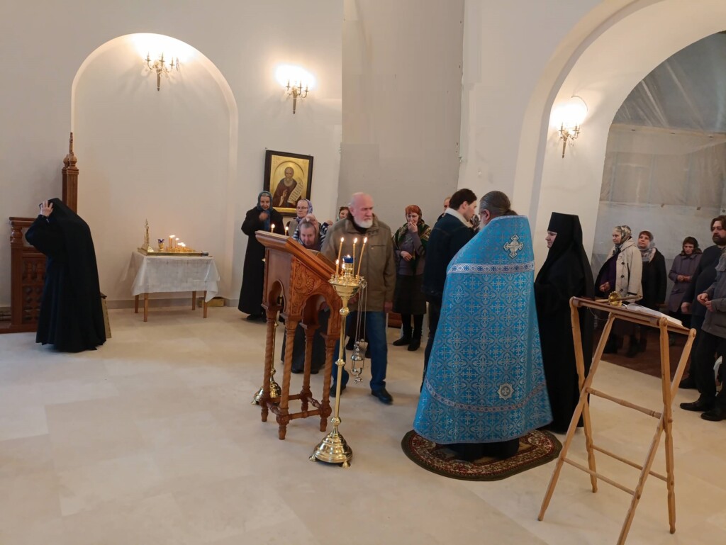 Вечером 27 марта 2026 года, в канун субботы 5-й седмицы Великого поста, именуемой Субботой Акафиста, на подворье нашей обители, как и в самом монастыре, совершено традиционное богослужение праздника Похвалы Пресвятой Богородицы. Во время службы исполнялся нараспев акафист Божией Матери "Радуйся, Невесто Неневестная". Многократно повторяемый кондак "Взбранной Воеводе" торжественно исполняется различными церковными напевами.