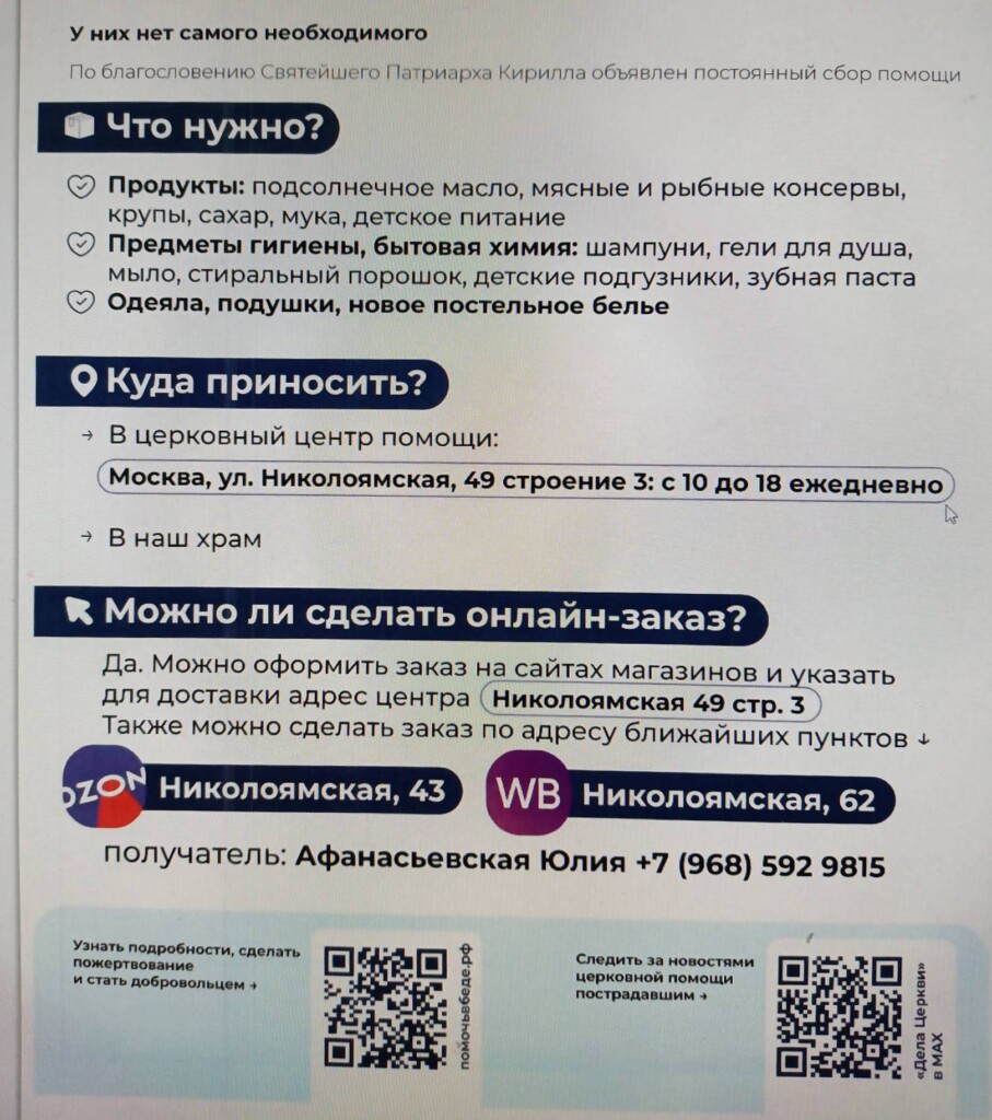 По благословению Святейшего Патриарха Московского и всея Руси Кирилла, в настоящее время проводится сбор продуктов питания, средств личной гигиены и бытовой химии для беженцев и пострадавших мирных жителей в зоне Специальной военной операции. Наша обитель ежемесячно участвует в таком сборе и доставке необходимого в церковный центр помощи на улице Николоямская.