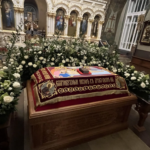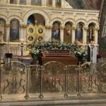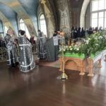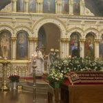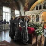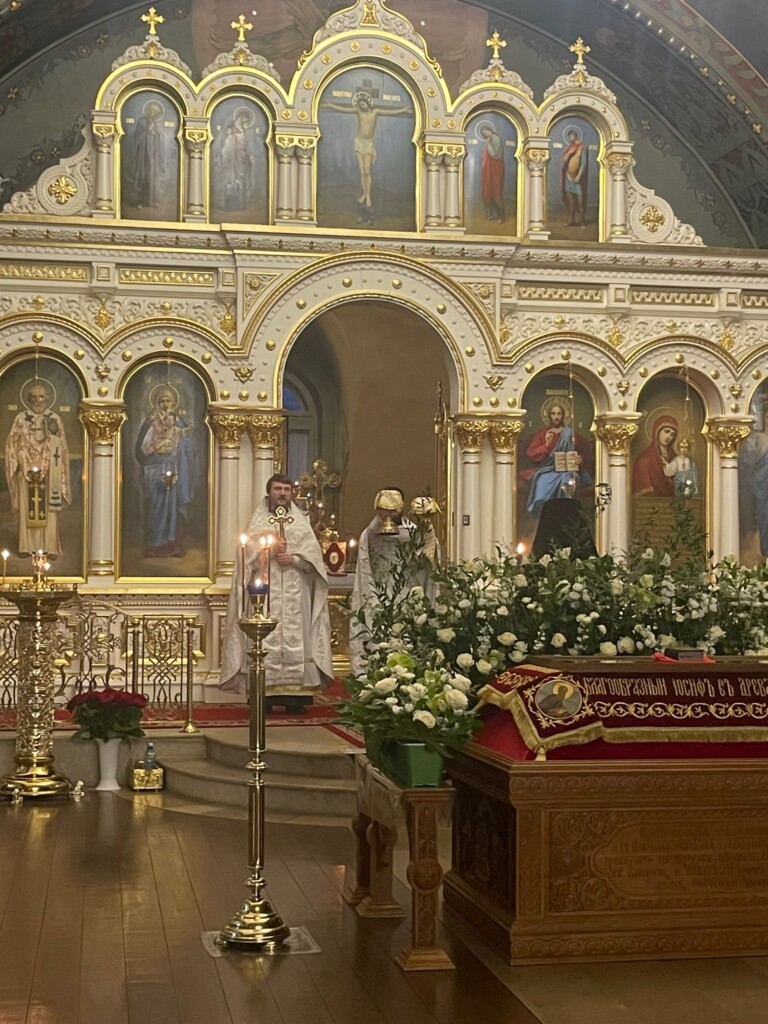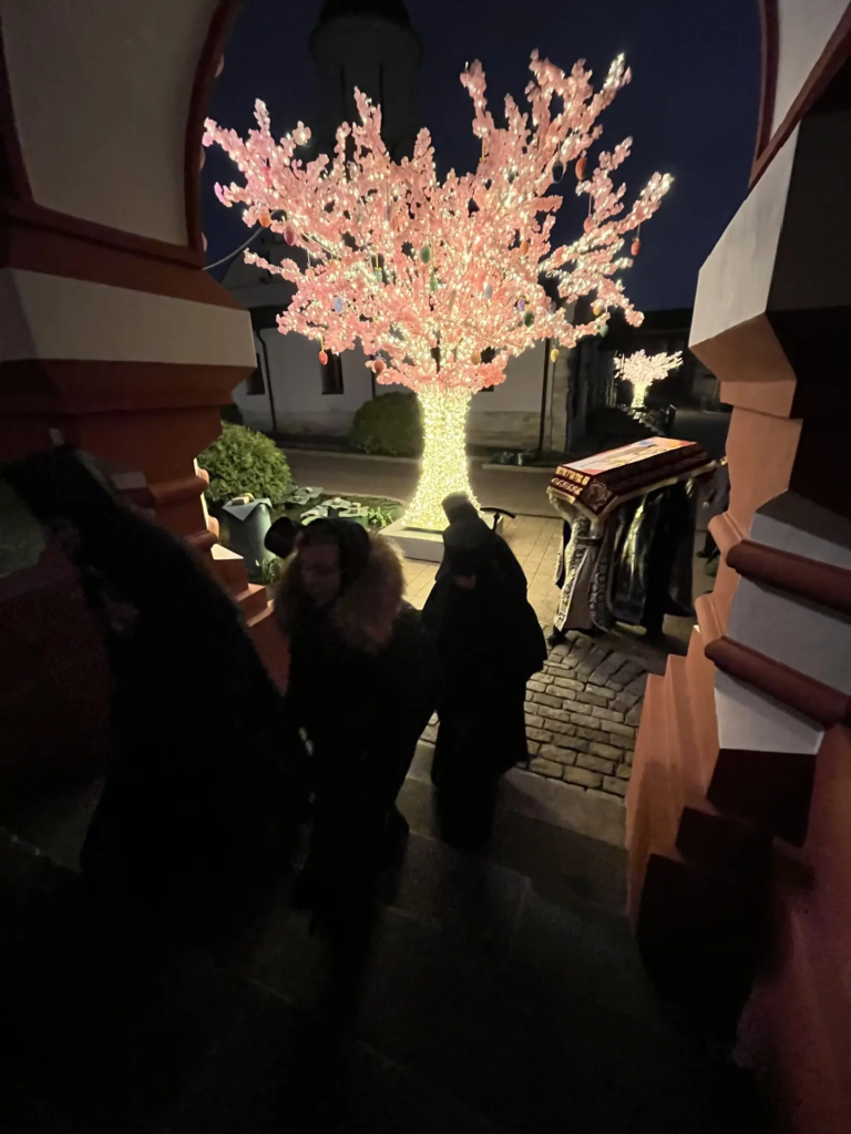 За это время священнослужители облачились в белые ризы, и все богослужебные облачения были переменены на белые. Таким образом, все в храме возвещает о грядущей радости Воскресения Христова, но в то же время носит печать Страданий и Погребения Спасителя.