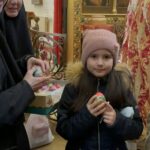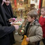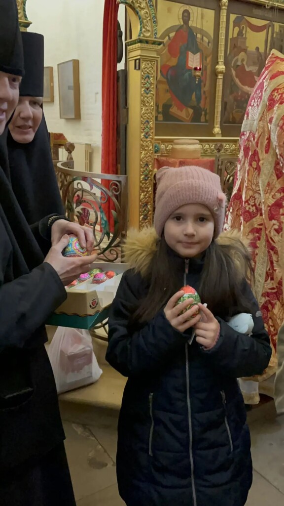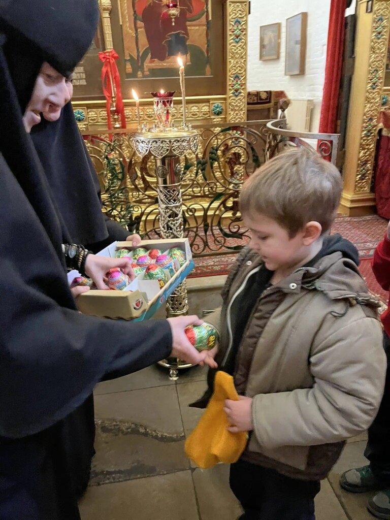 В конце ночного богослужения Матушка Игумения поздравила детей, пришедших на службу, с праздником и вручила им пасхальные подарки.